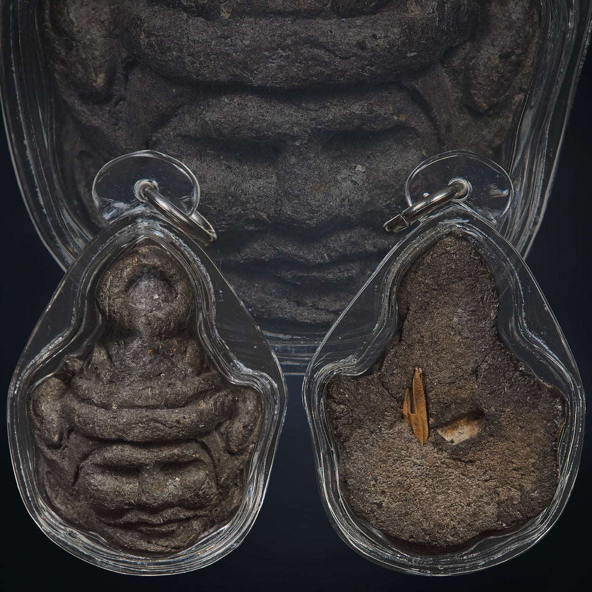 The back of the piece often contains takrut or relic fragments inserted during chanting — acting as conduits between the spiritual and physical realms. Such additions were not decorative but functional, empowering the amulet to radiate guidance, charisma, and subtle influence over human emotion.