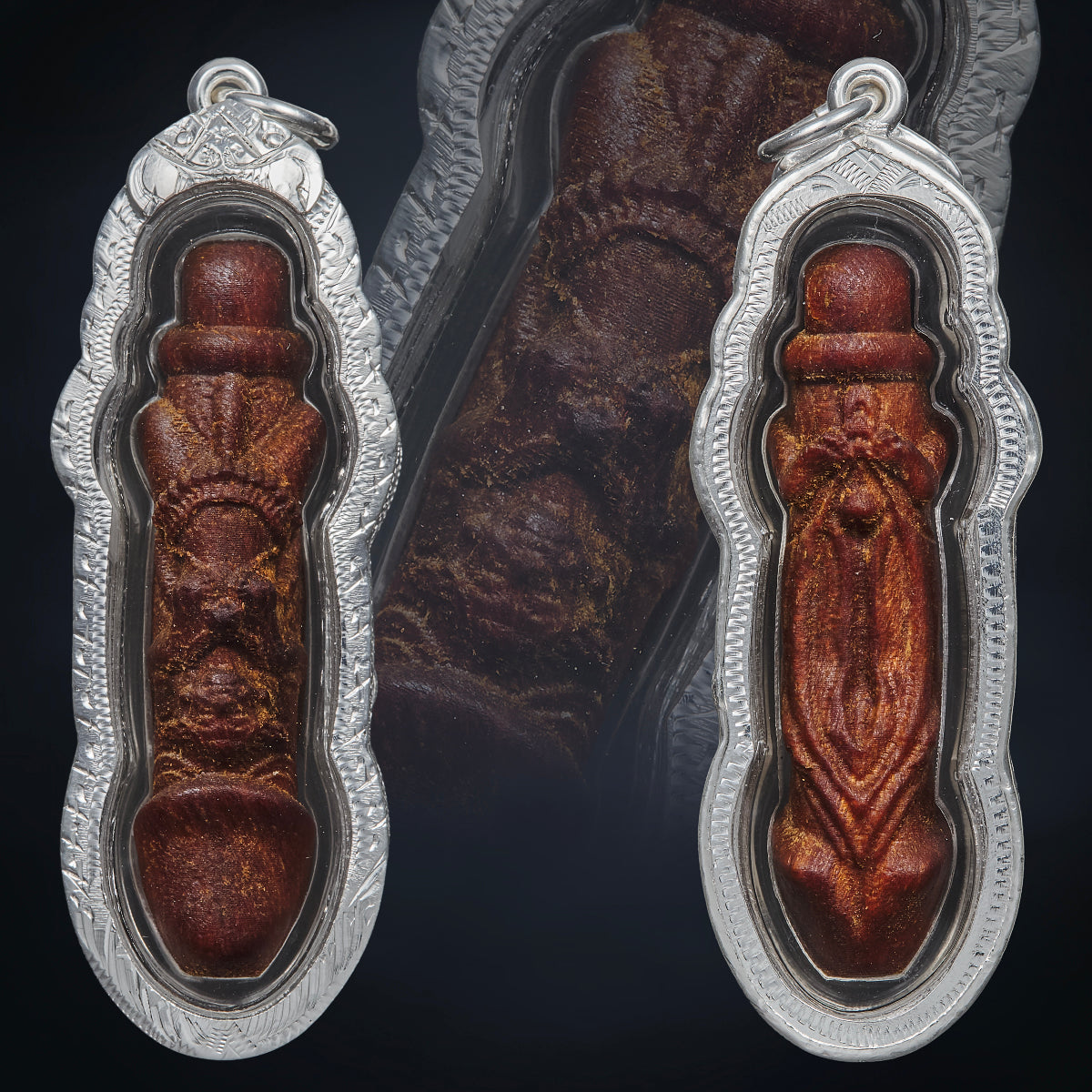 This Palakit by Arjan Dar Parkan represents one of his strongest saneh creations, crafted from Mai Payoom, a material favored for its living, fiery nature and its ability to hold deep energetic charge. It was soaked long-term in Naman Saneh, layer upon layer, before going through multiple blessing rounds directly under Arjan Dar’s hand. After consecration, it was placed on the altar of his close luksit, Ac Piak, to continue absorbing ritual energy.