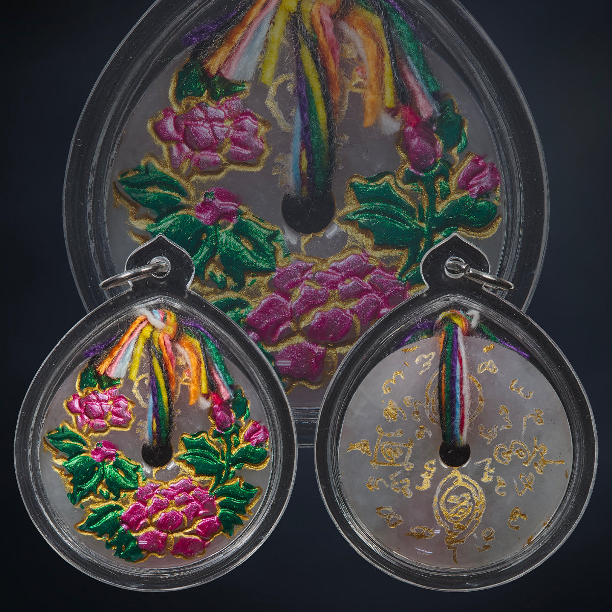 Ac Satien personally carved each piece by hand within his temple workshop. After carving the floral motifs, he hand-painted every detail, layer by layer, imbuing the charm with intention and focus. The front carries vibrant floral imagery symbolising growth, attraction, and continuous renewal, while the reverse bears sacred inscriptions applied by hand in gold—anchoring metta, ease of interactions, and day-to-day protection.
