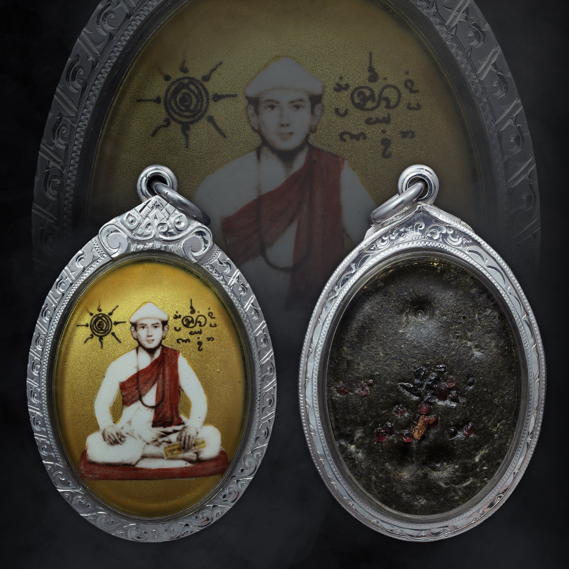 This piece belongs to a special batch created by Ajarn Satien, who personally travelled to Myanmar to obtain relic-materials aligned with hermit and forest-dwelling lineages. The locket form was chosen because it allows both the image and the relics to coexist in one structure: the face of the master on the front, and the physical spiritual residues on the back.