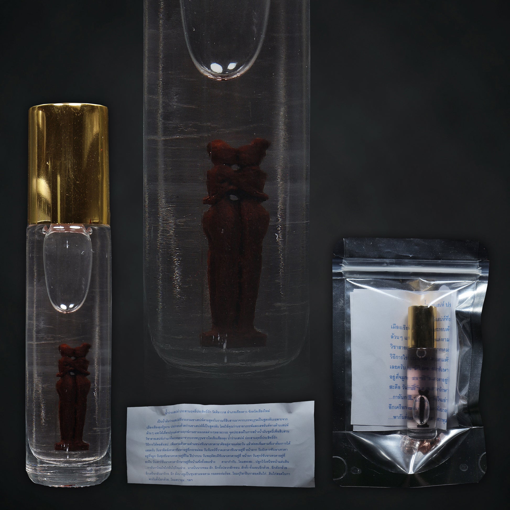 This sacred charm oil is the product of a refined esoteric formula focused on metta (loving-kindness), seneh (charm), and universal attraction. The recipe traces its origins to ancient Sri Satchanalai, a center of spiritual and magical learning in old Siam, and has been carefully preserved and passed down through a lineage of Lanna lay Arjans and monks.