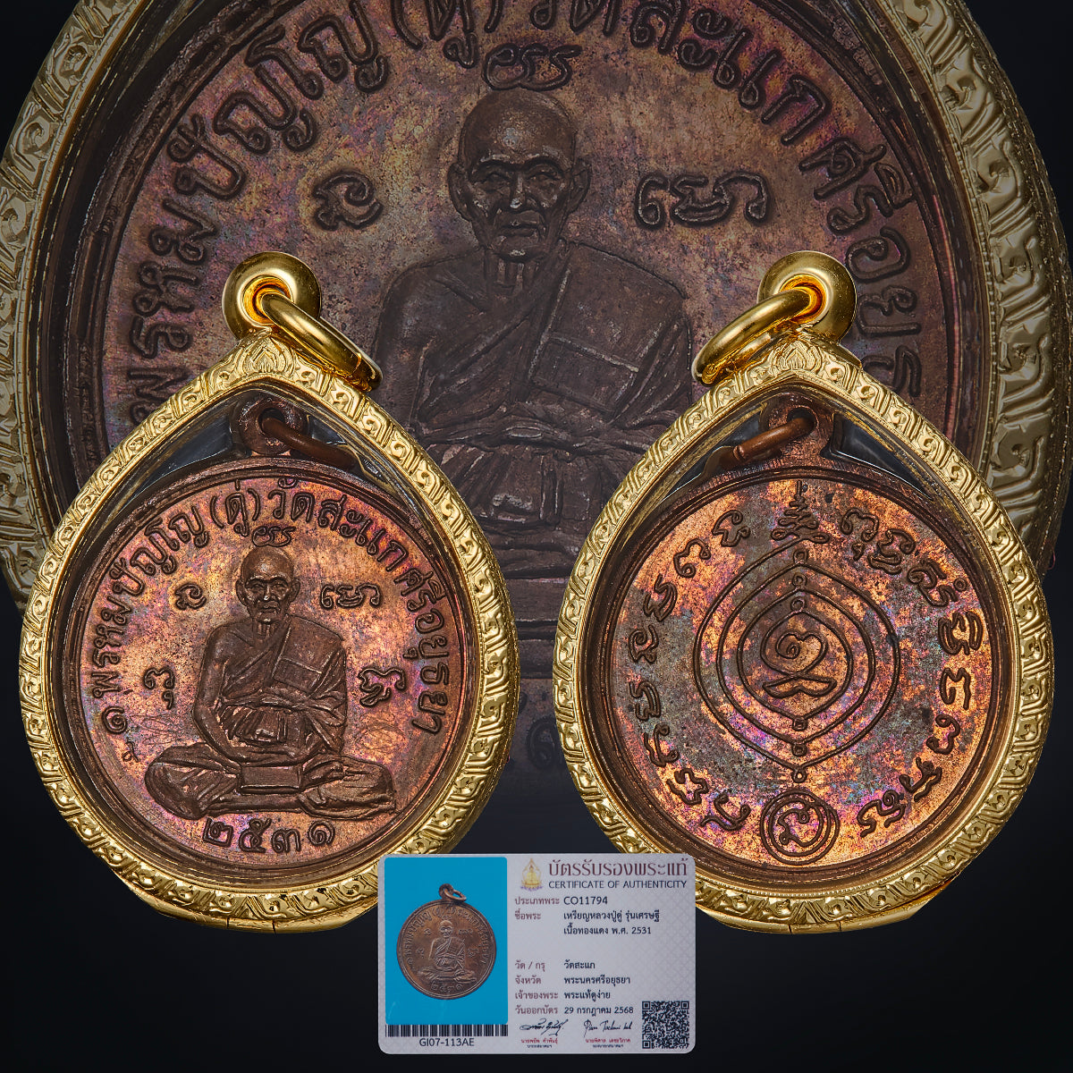 Created in BE 2531 at Wat Sakae, Ayutthaya, under the direct blessing of Luang Pu Du Phrommapanyo. The coin was pressed in round form with an integrated loop. The obverse shows Luang Pu Du in full meditation posture surrounded by sacred yant inscriptions, with the text “๑ Phrommapanyo (Du) Wat Sakae Sri Ayutthaya” and the year 2531 below. The reverse carries a full yantra design for prosperity and protection.