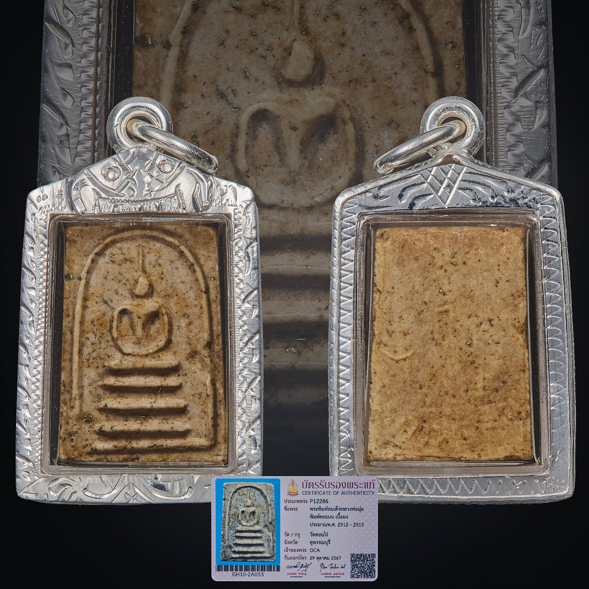 This is the Somdej Pim Kaenean, a small-sized votive tablet blessed by Luang Phor Mui of Wat Don Rai, created in B.E. 2515 (1972). This lesser-seen Kaenean variant served as a batch marker, with one Kaenean piece pressed for every 100 full-sized Somdej—making it significantly rarer while containing the exact same spiritual blessings.