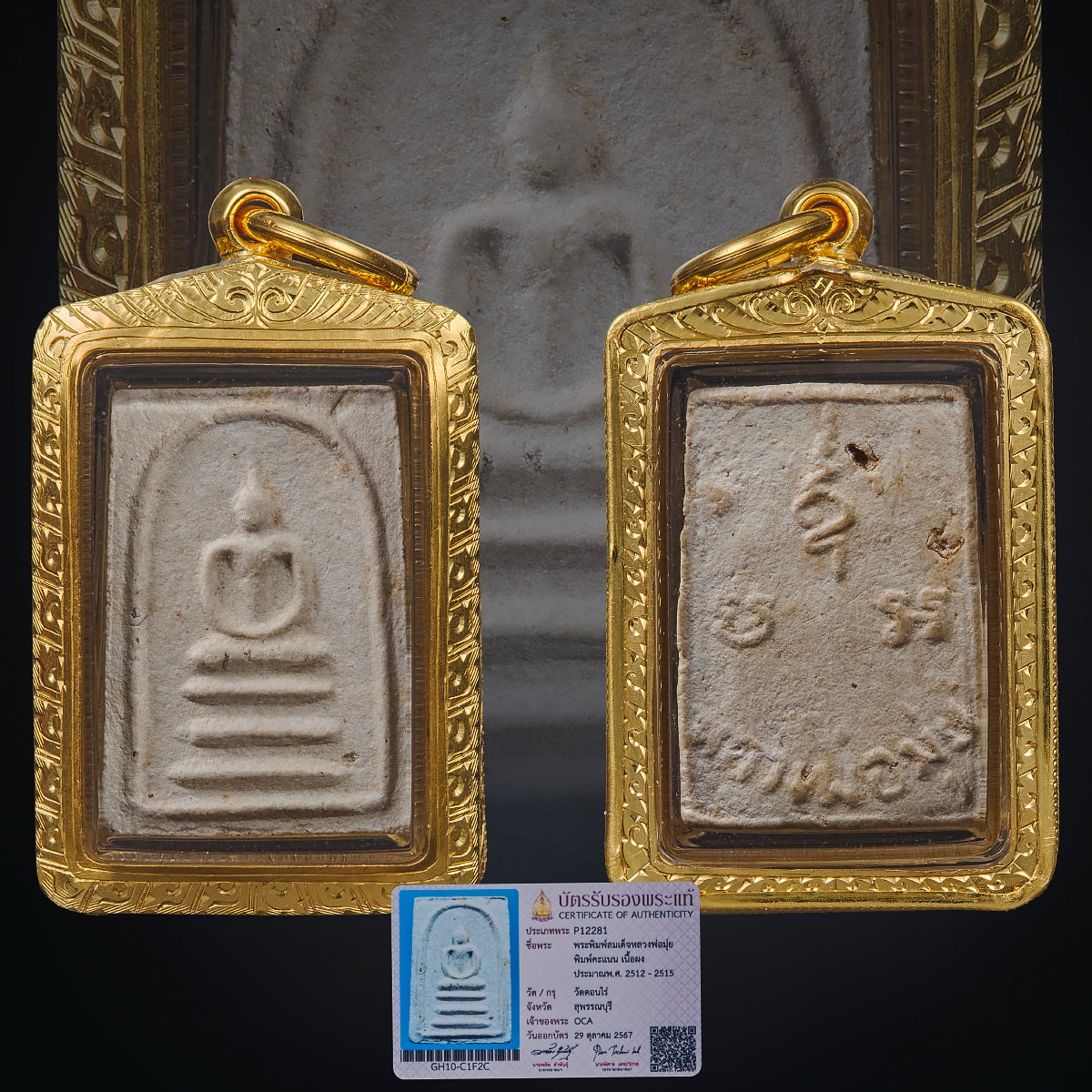 The Somdej Pim Kaenean was created in B.E. 2515 (1972), during the twilight years of Luang Phor Mui’s life. It was part of a final consecration series of Somdej votive tablets, each pressed from his personally prepared sacred powder mixture (Nur Pong). This powder contained finely ground fragments of holy scripture powders, old temple relic dust, sacred flowers, herbs, and even Luang Phor Mui’s own hair relics — symbolizing his personal spiritual essence imbued into each piece.