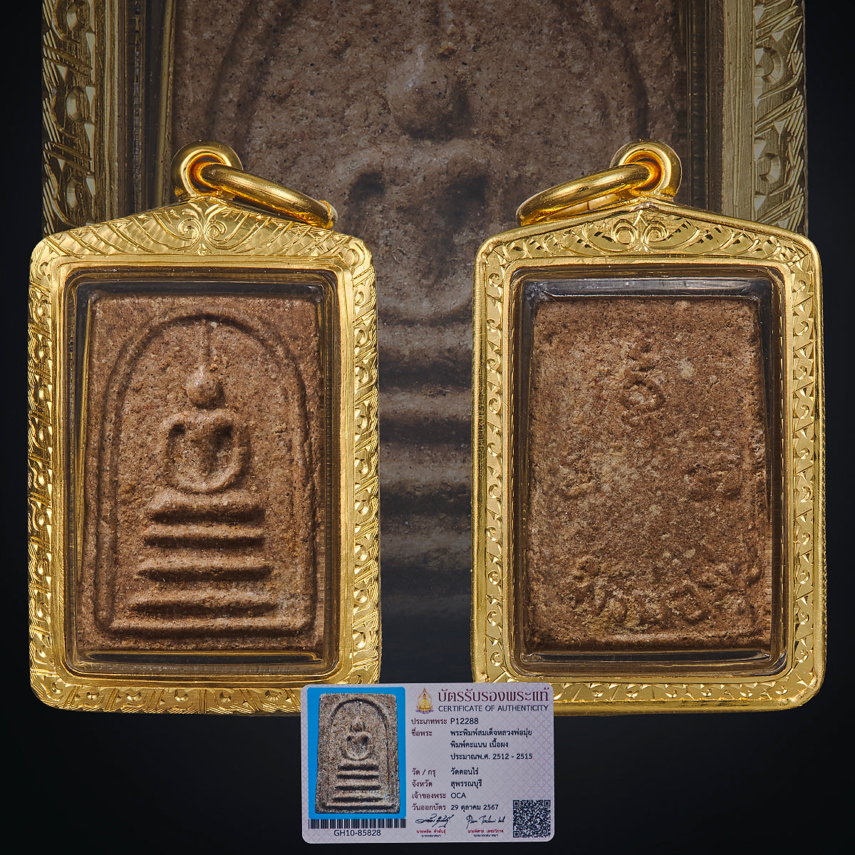 The Somdej Pim Kaenean was created in B.E. 2515 (1972), during the twilight years of Luang Phor Mui’s life. It was part of a final consecration series of Somdej votive tablets, each pressed from his personally prepared sacred powder mixture (Nur Pong). This powder contained finely ground fragments of holy scripture powders, old temple relic dust, sacred flowers, herbs, and even Luang Phor Mui’s own hair relics — symbolizing his personal spiritual essence imbued into each piece.