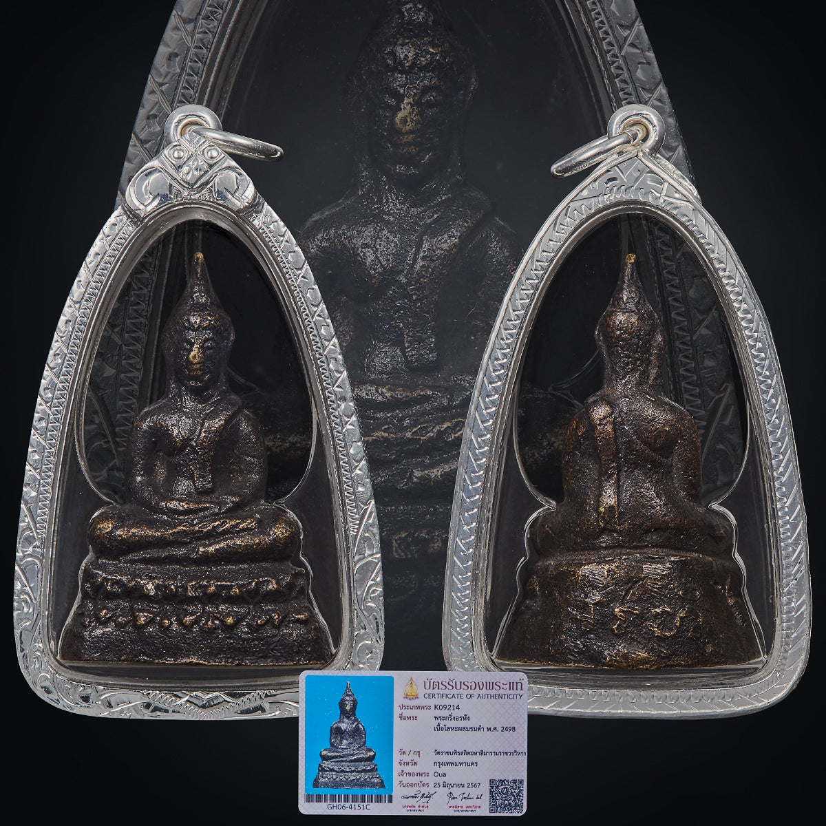 A total of 10,009 Phra Kring Arahant amulets and 100 two-faced Phra Kring amulets were created. The crafting process involved the skilled artisans of Ban Chang Lor (a traditional metal-casting community), led by Master Fong. The sacred metal plates—comprising gold, silver, copper, and brass—were inscribed with mystical yantras by more than 108 revered monks from across Thailand.