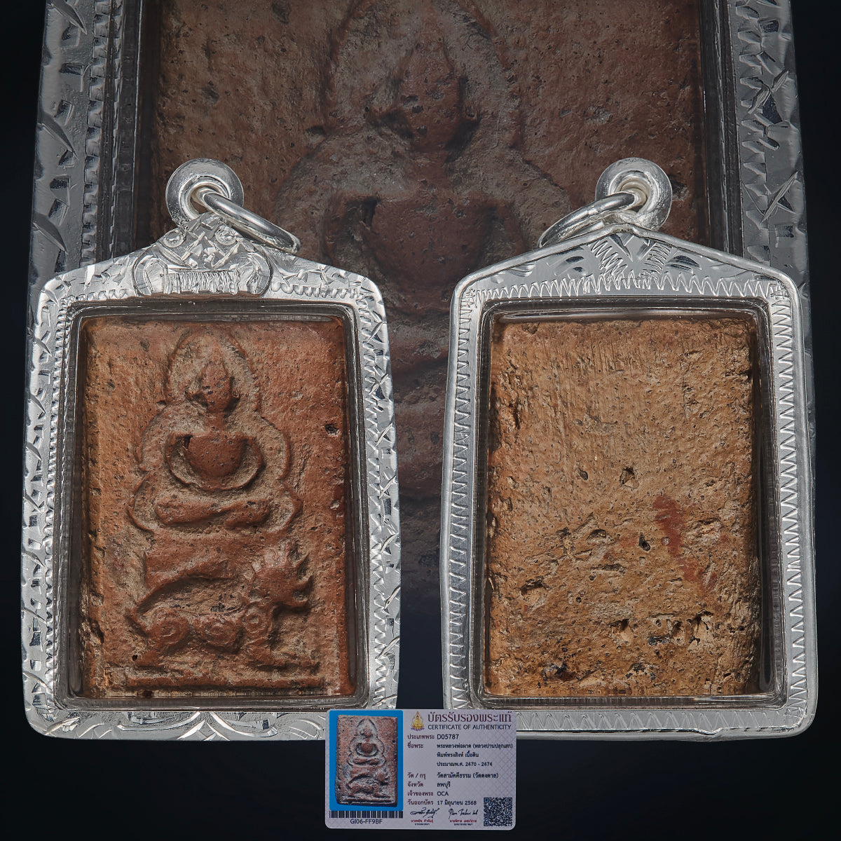 During the restoration of Wat Dong Tan’s main chapel in 2000, thousands of small clay Buddha amulets were discovered sealed beneath the principal Buddha statue. Each piece shows the Buddha in meditation above a tiger or singha, with a small chamber on top containing sacred powders prepared through old yantra-writing rituals. The clay mixture is coarse with mineral grains, fired in earthen jars that produced natural color tones from white to deep brown—proof of traditional craftsmanship.