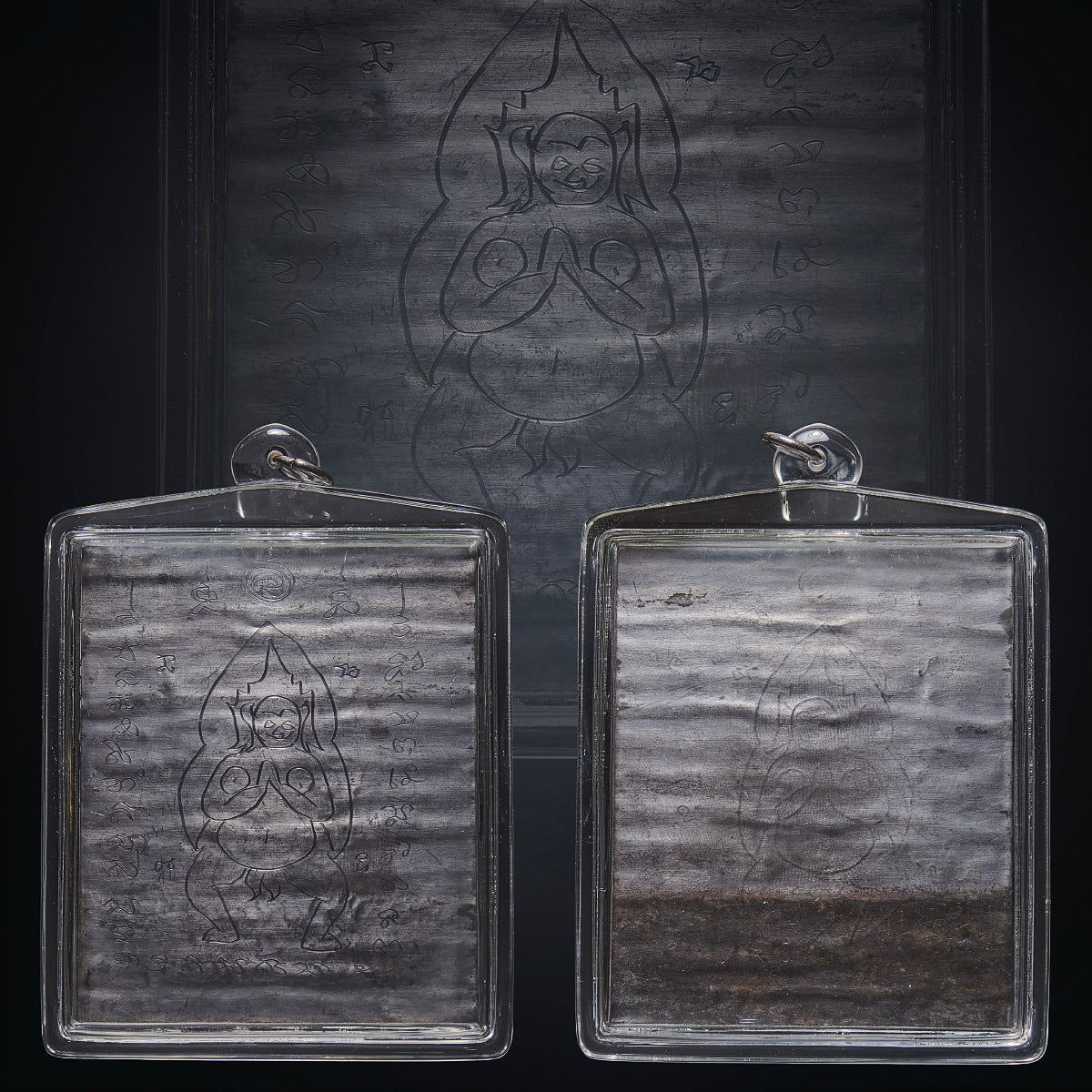 This piece, created in 2548 BE (2005) by Luang Phor Up of Wat Tong Sai, is a rare Mae Nang Pim yant inscribed on sacred metal. I chose to frame it in plastic for preservation, as pieces like this are seldom found in clean condition.