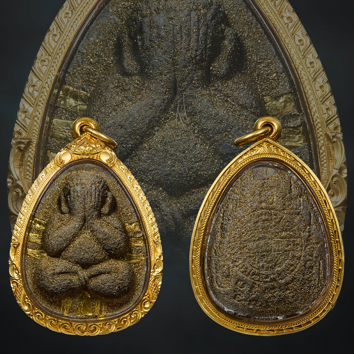 Crafted from sacred Phutthakhun powders, this revered Phra Pidta features delicate gold shavings (takrut thong) embedded throughout the body, symbolizing divine light shielding the bearer from harm. On the front, 9 Solid Gold takruts are meticulously inserted—representing the 9 sacred realms and anchoring the amulet’s power across all directions.