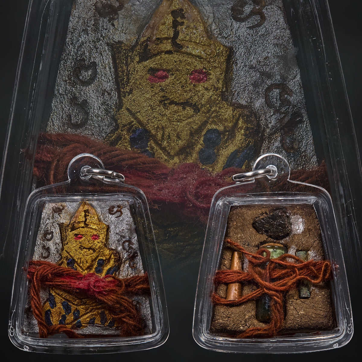 The main body of the Lersi Keow is carved from a fossil relic discovered within that very cave — a hardened material formed over long cycles of natural and energetic compression. On the reverse, the piece is backed with cave stones and soil taken only from the exact areas where generations of Lersis once sat and meditated. This grounding base holds an almost magnetic stillness — the kind of energy that can only come from years of focused spiritual absorption.