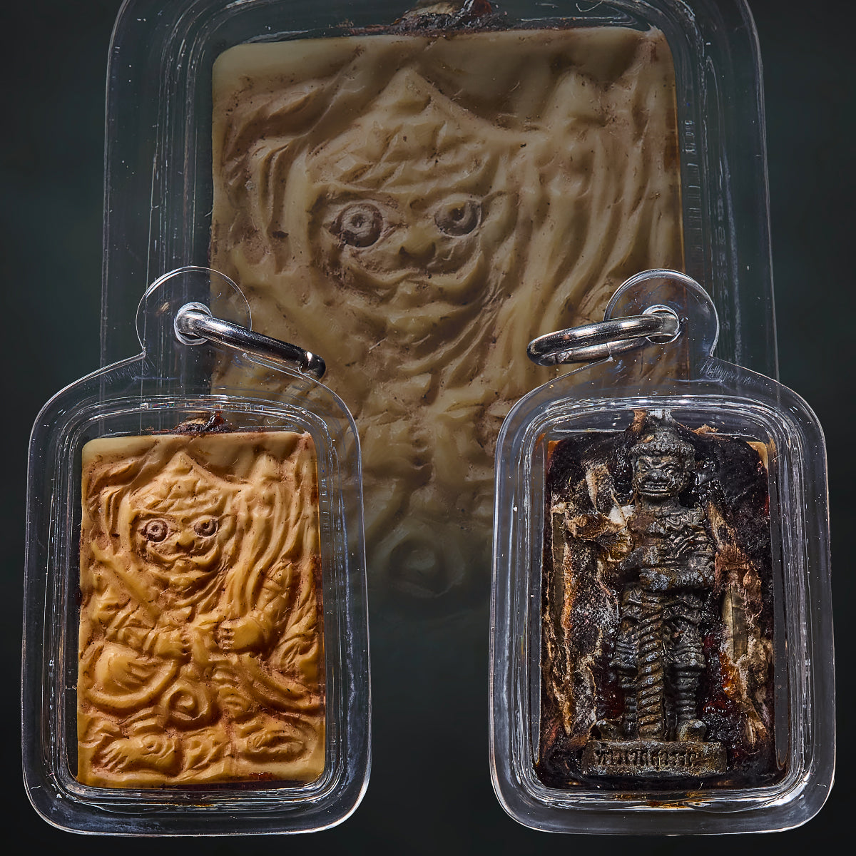The front panel is formed from graden—a rare compound of sacred herbs and resins—with gaduk chang blended into the matrix. Gaduk chang is valued for strength, memory, and unwavering determination. It binds baramee (spiritual merit) to the user's core and is often used in high-ranking protector wicha.