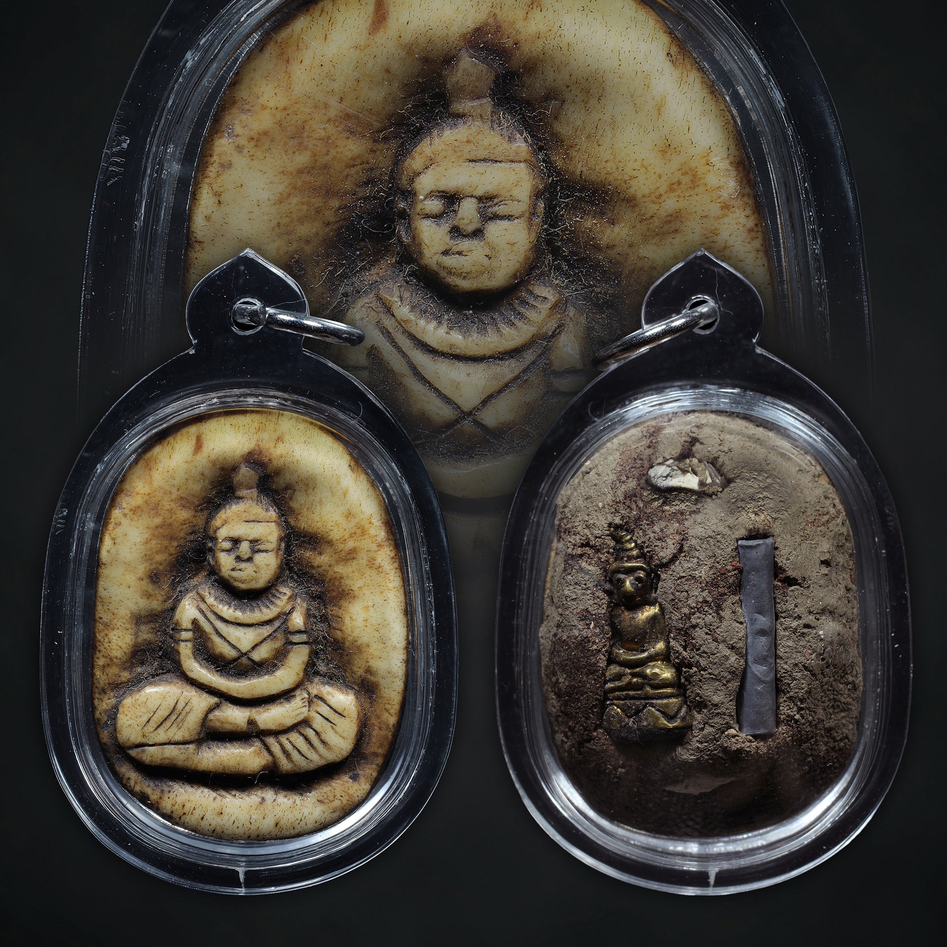 The amulet is constructed from gaduk chang (sacred elephant relic material), blended with seven cemetery soils, each soil gathered from spiritually charged grounds to enhance the potency of the piece. On the reverse side, Por Sala Tan embedded a small paneang chip from a Mae Prai relic, further strengthening its connection to the unseen world and deepening its efficacy in wish fulfillment and magnetic influence.