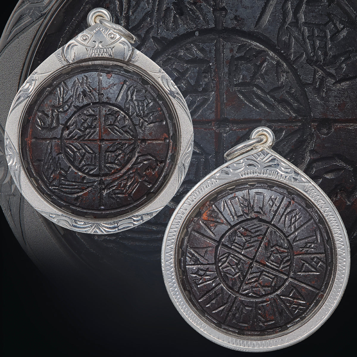 The inscriptions on the surface are not ordinary yantras but alien-like glyphs, their geometry echoing Rahu and lunar magic. In Indian tantra, meteoric iron has long been tied to Rahu yantras for reversing misfortune and swallowing danger. Among Tai Yai shamans and Lanna masters, eclipse seals on blackened metals were used to bind unseen entities. For Meo (Hmong) shamans, sky-fallen iron coins marked with cross-and-circle designs were guides in trance journeys, functioning as spirit passports.
