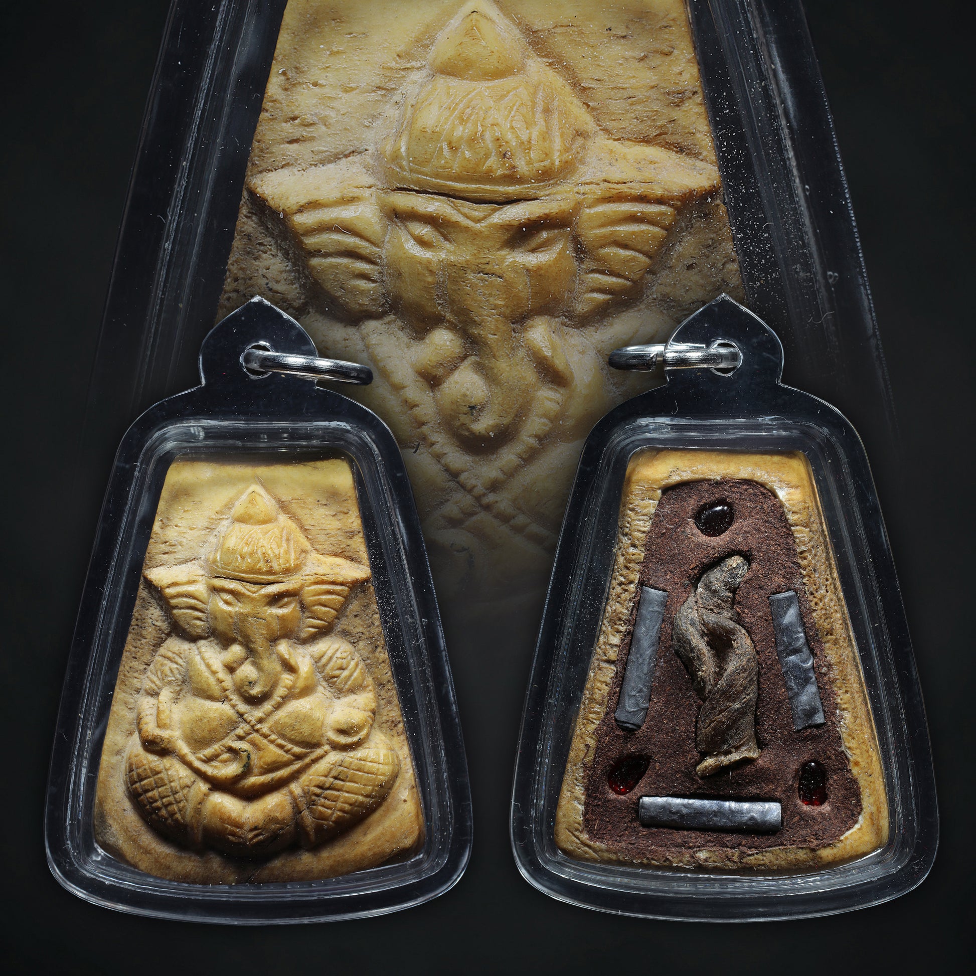 Three takruts were placed to harmonize the different forces within the piece, balancing protective and progressive energies. The base mixture also includes soil collected from seven Buddhist sites, rooting the amulet in merit and anchoring it to sacred ground.