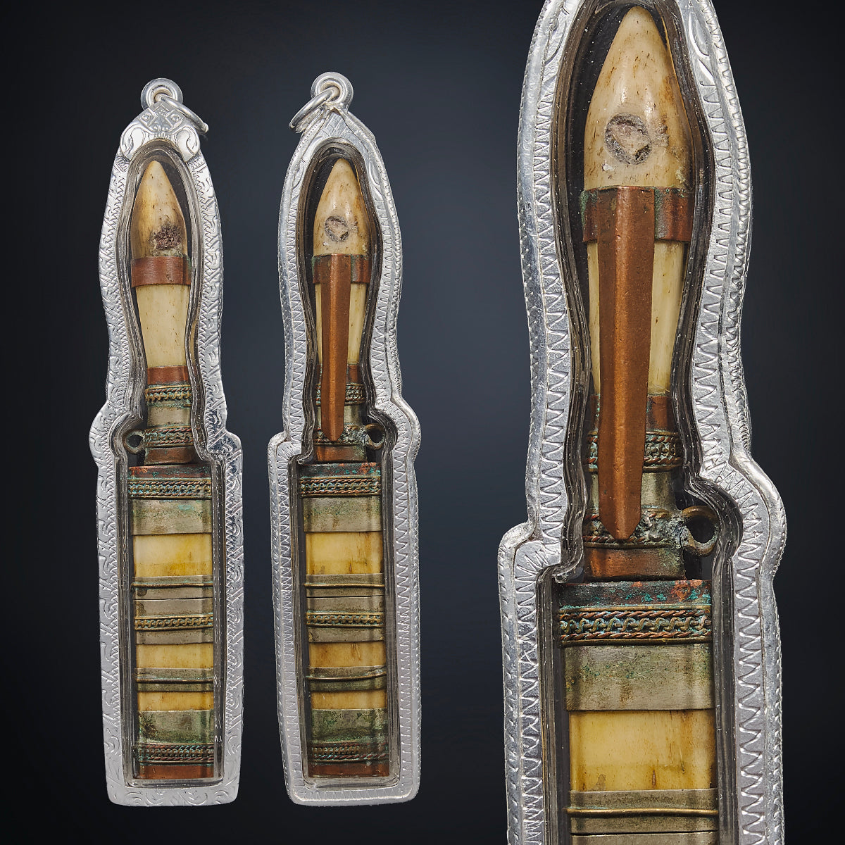 This miniature Meed Mor (ritual knife) is a rare creation from Por Sala Tan, fashioned from Gaduk Chang Kraden (Old relic material). Measuring just 3 inches in length, it is compact yet fully empowered, wrapped in silver for preservation and ease of keeping.