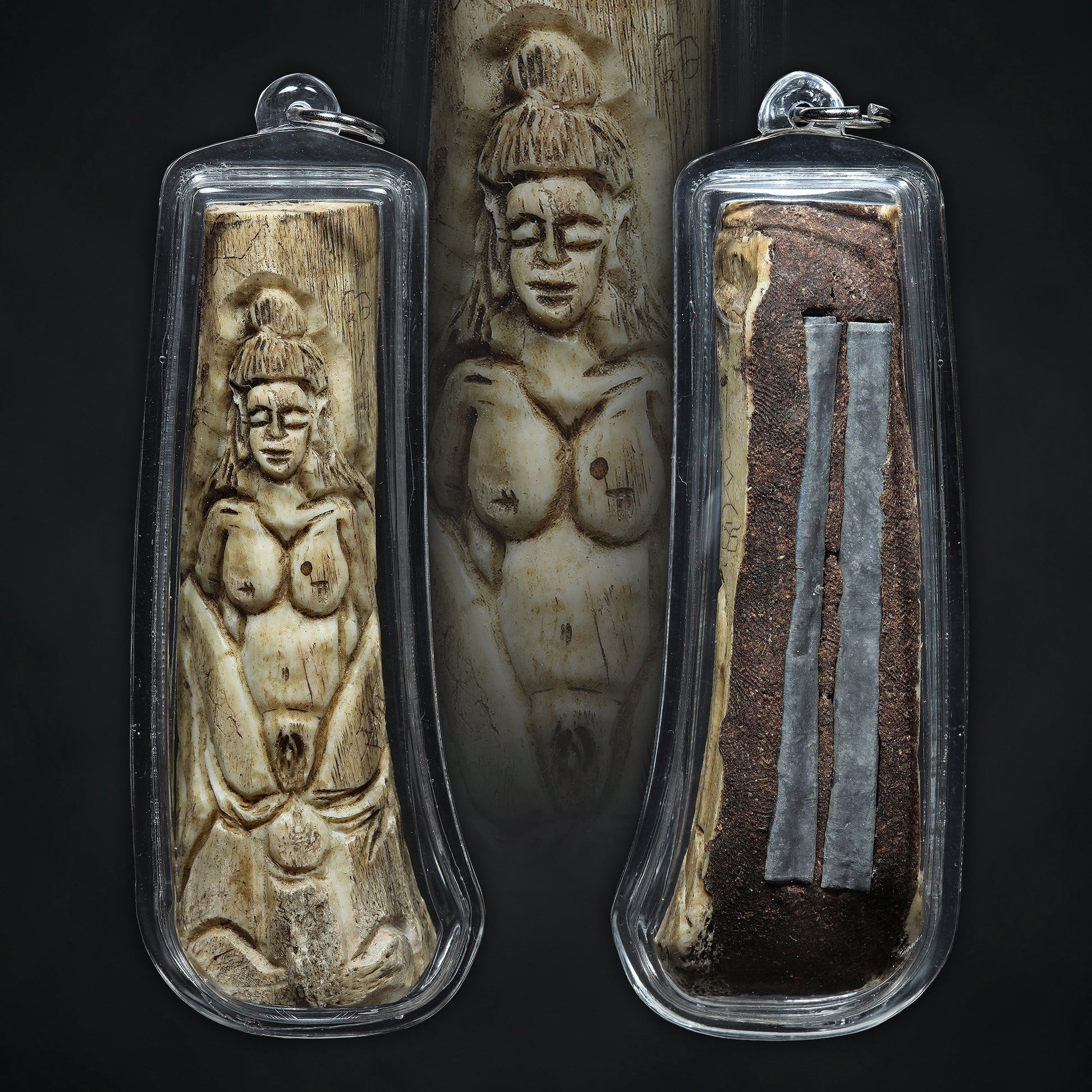 The carving represents Mae Per, the primordial female spirit of charm and desire in Thai–Khmer animist and tantric traditions. Mae Per is invoked as the embodiment of feminine magnetism, fertility, and irresistible attraction. She is often depicted in a nude form, emphasizing openness, seduction, and the raw force of maha sanaeh (great charm).