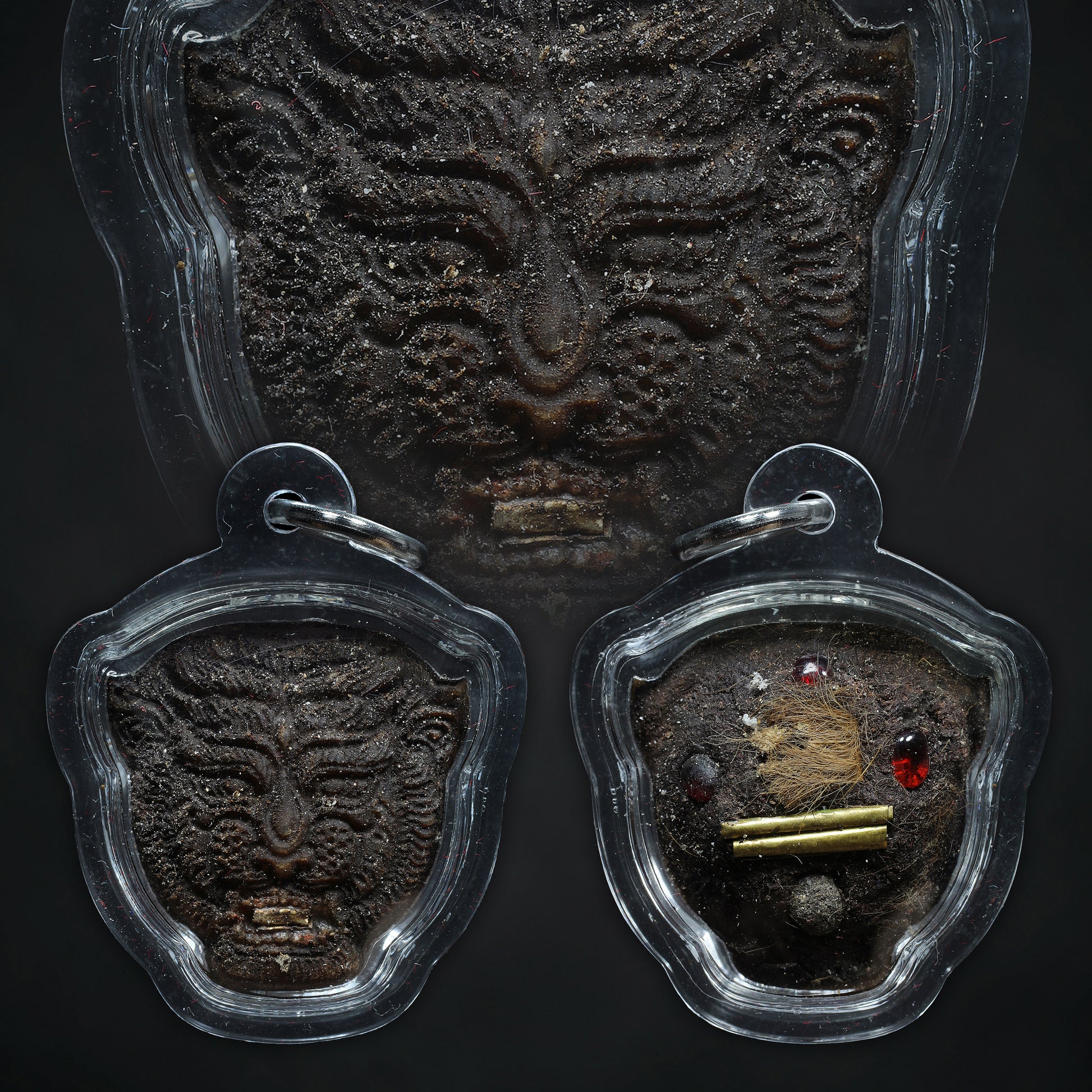 The piece comes from the Wai Kru batch พ.ศ. 2545, created by Por Sala Tan. Some of these amulets were not distributed at the time and were later kept under the care of Arjan Lek. Unlike the standard Rahu pieces of this batch, this tiger head was produced as a rare variant, marking it apart from the rest of the release.
