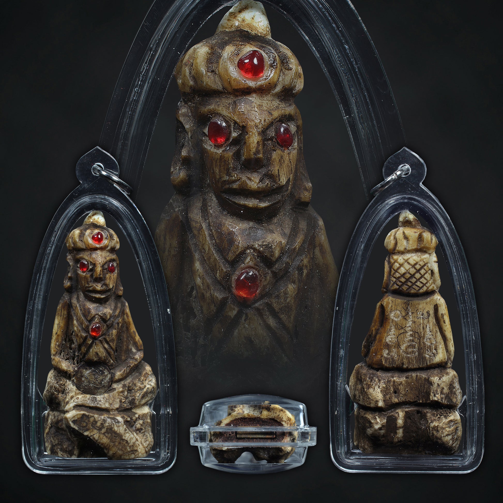 This piece represents a rare Burmese incarnation of Lersi Ta Fai, created by Por Sala Tan with extraordinary care and lineage reverence. It is carved from gaduk chang kraden, a sacred material historically linked to spiritual grounding and durability, and further infused with holy soil from Mount Popa in Burma—an epicentre of hermit and nat spirit veneration.