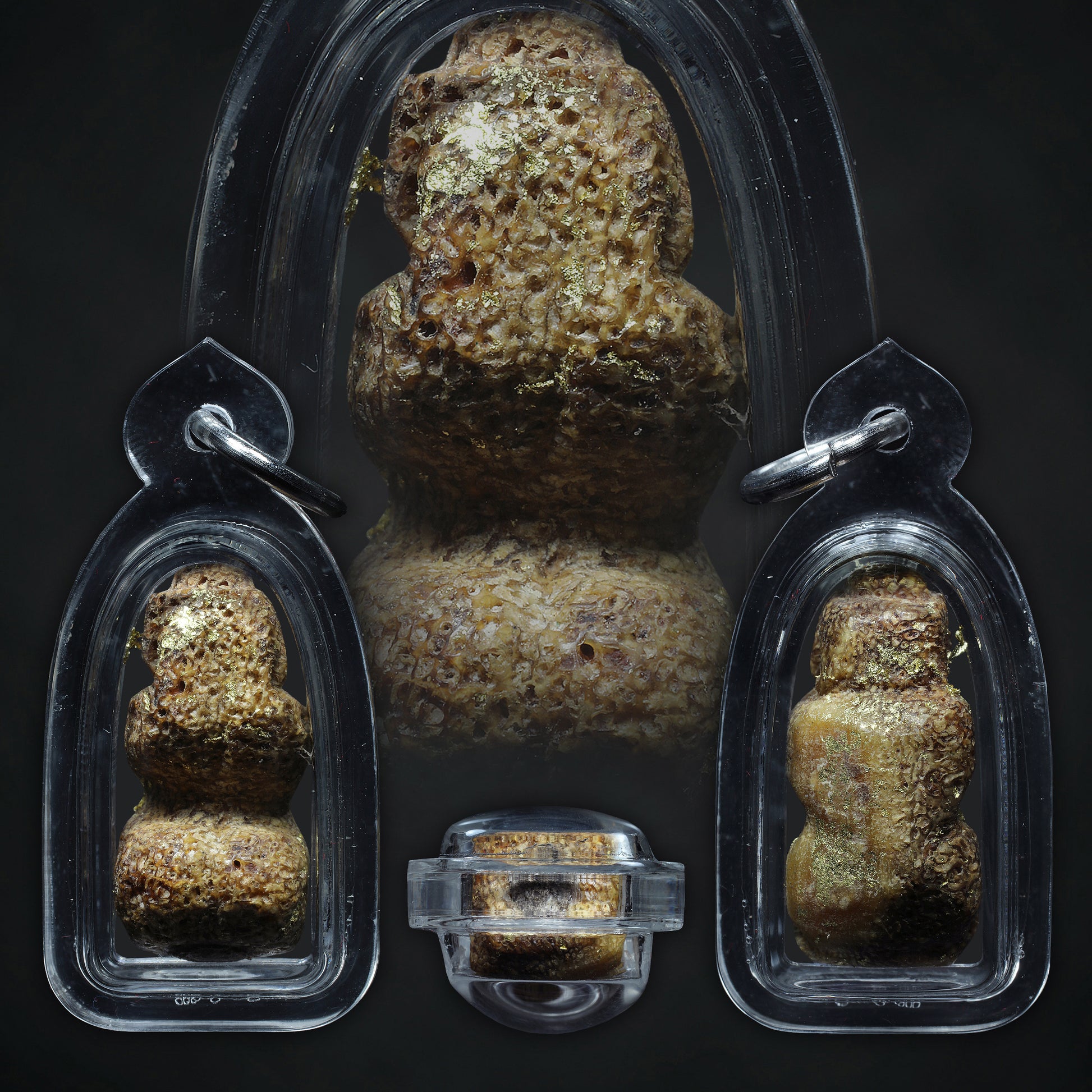 Por Sala Tan practiced the Pidta wiccha, a tradition emphasizing withdrawal from worldly distractions and deep inner concentration. By consecrating relic material into this form, he transferred not only his meditative force but also the accumulated spiritual weight of the departed holy man. The soil of the cave where the relic was found was pressed and layered beneath, grounding the amulet in the very place where long years of practice had once been carried out. This combination of bone and cave soil represents both the impermanence of the body and the endurance of dhamma practice.