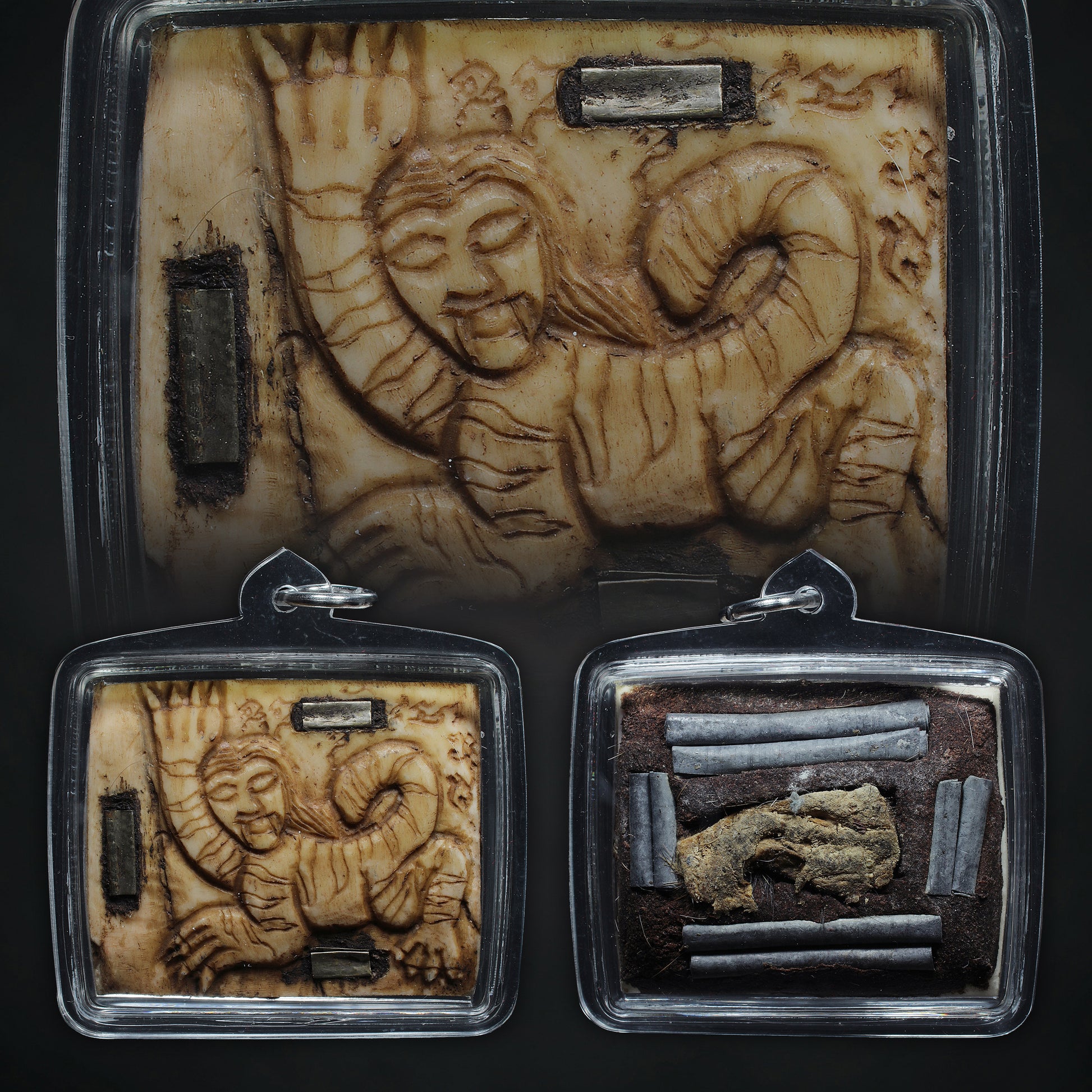 The back is fitted with a relic of suer kraden, anchoring the amulet to the raw vitality of the tiger. Around it are takruts, each inserted to harmonize the energies within the piece. The takruts ensure that the tiger’s force, the relic’s vitality, and the wearer’s own field work in balance. Rather than a chaotic display of raw power, the energy becomes stable, directed, and usable in daily life.