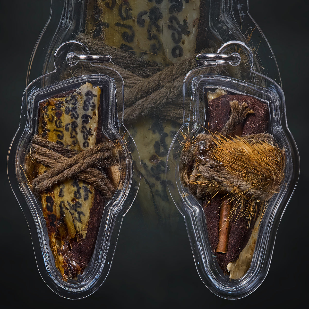 The amulet is composed of Mae Karen’s relic fragments, ritually secured and inscribed by Por Sala Tan. The surfaces carry inked yantra to stabilise her force and direct it toward protective and magnetic functions. Binding cords and ritual wrappings were applied to complete the consecration, sealing the spirit within a controlled vessel. The inclusion of tiger-linked elements ensures her dual essence is properly aligned. Every part of the construction reflects Por Sala Tan’s method of fusing spirit, relic, and wiccha into a harmonious talisman.