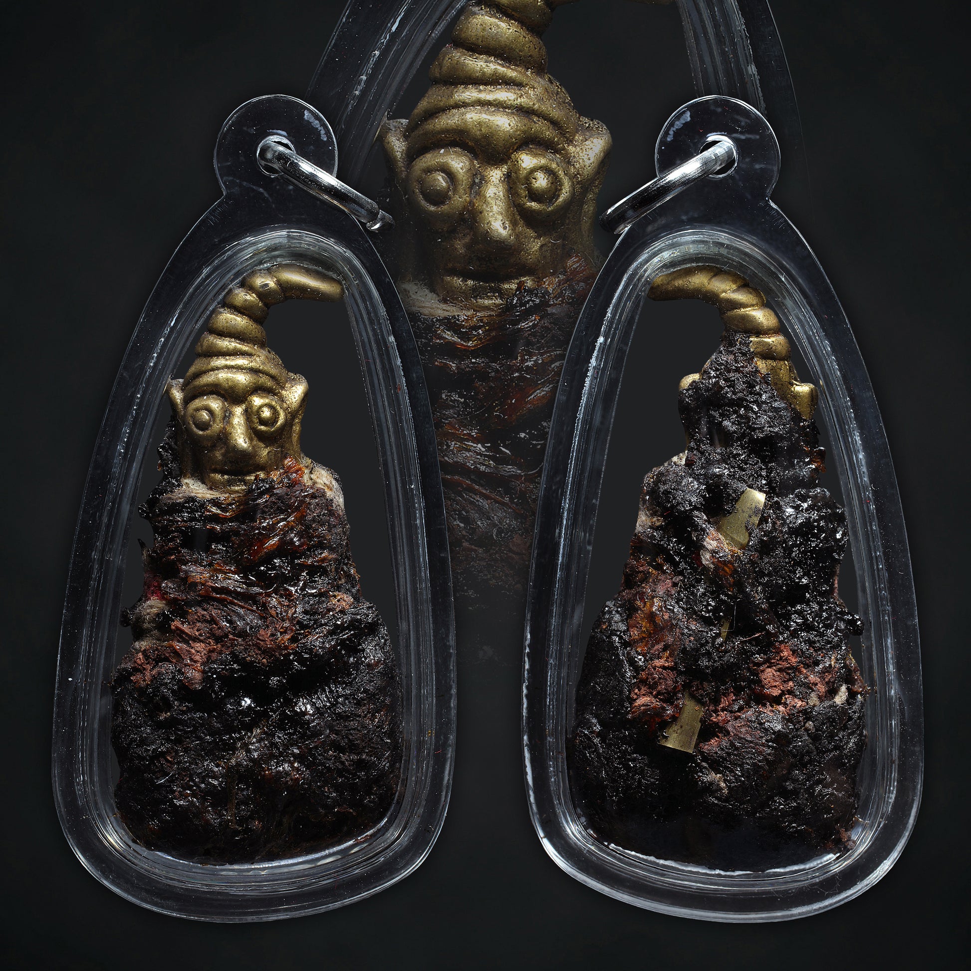 The surface of the piece is marked by the tidjai relics layered into its body, anchoring the spirit firmly into the physical vessel. Alongside, takrut inscriptions were embedded to harmonize and stabilize the energy, making the piece not just potent but controlled.