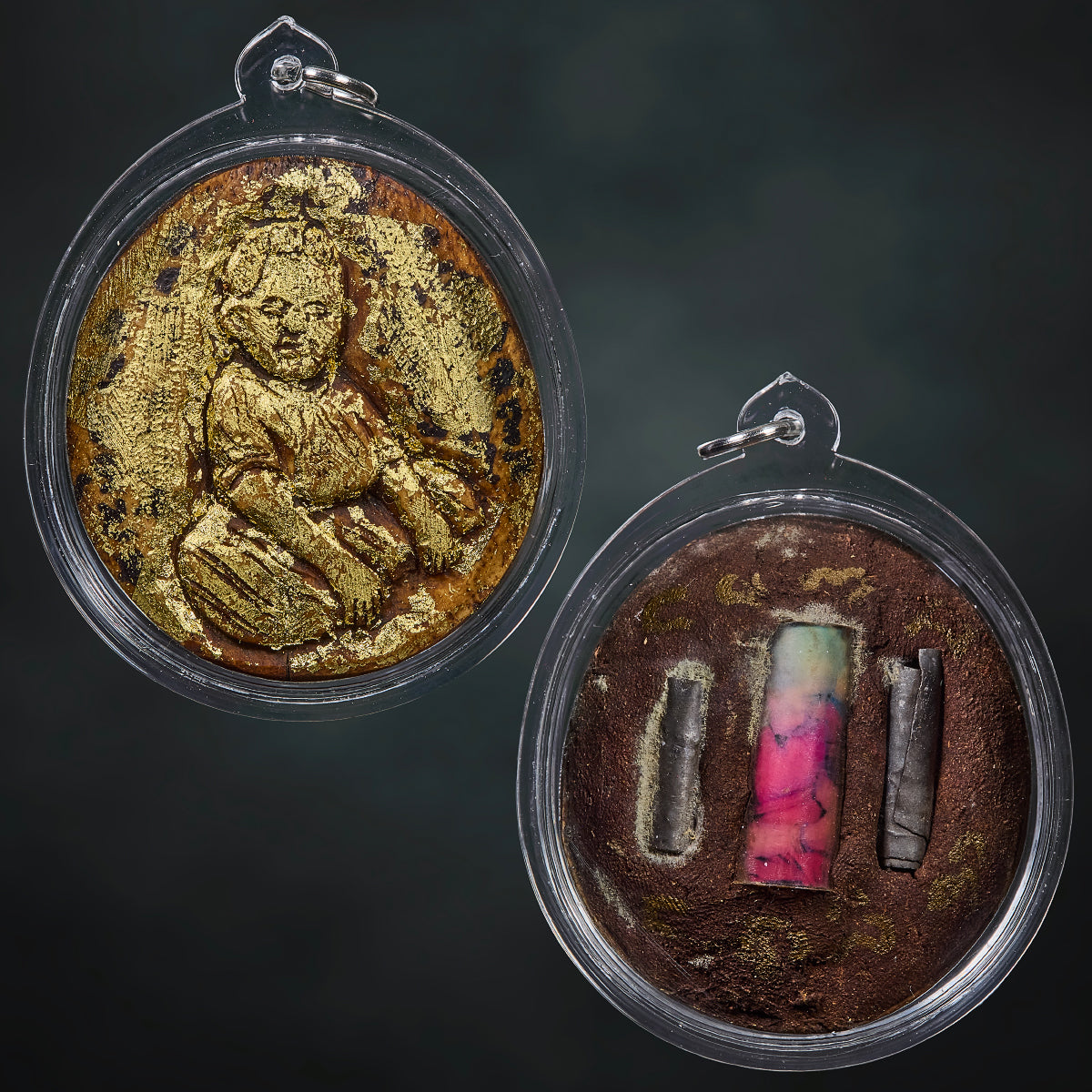 The two embedded tarkruts serve as energetic stabilizers, balancing the flow of blessings for both spiritual and material growth. At the center lies a rolled photograph from the 2nd batch Roop Tai, believed by Ac Lek to contain hidden yantra inscriptions within the inner layer of the print — a symbolic connection between image, prayer, and reality.
