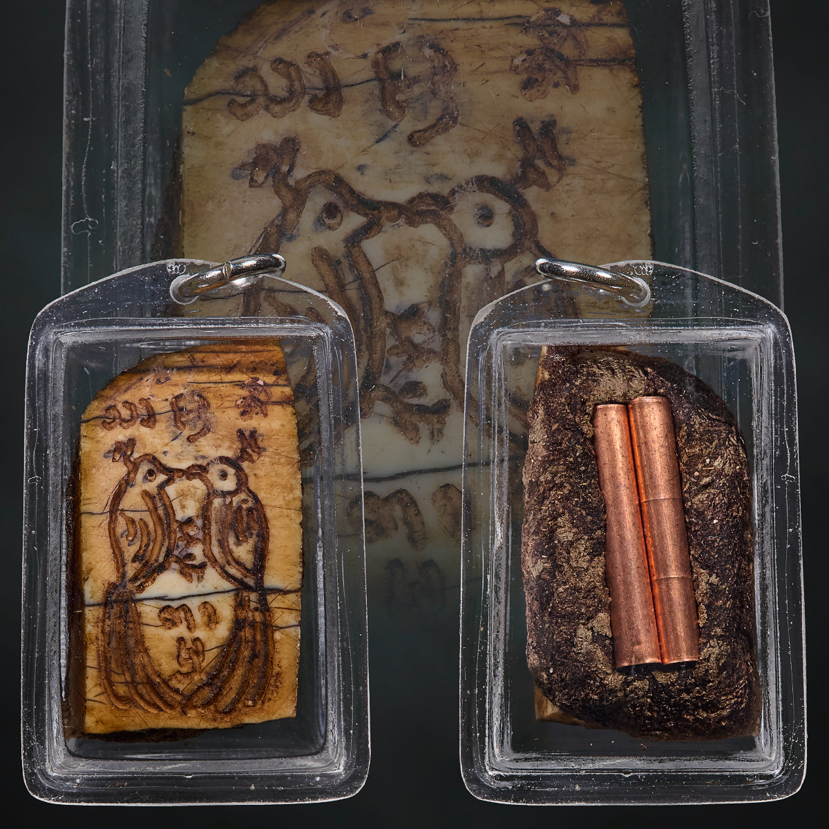 Each piece features a carved depiction on Graduk Chang material, enhanced with sacred soil from the same tree, believed to contain phong baramee ton mai — the spiritual vitality of nature. Two copper takruts were inserted on the reverse, representing attraction (saneh), charm, and material stability. The combination of Graduk Chang essence and earthy grounding from the tree creates a balanced energy of both drawing and holding — ideal for traders, businesspeople, and those who rely on relationships for success.