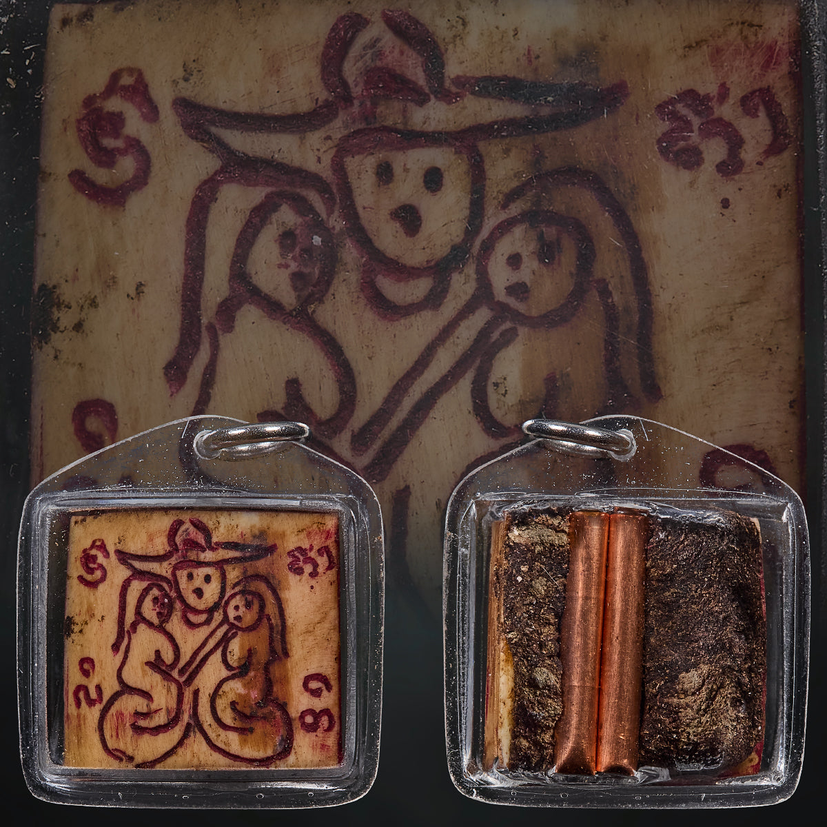 Each piece features a carved depiction on Graduk Chang material, enhanced with sacred soil from the same tree, believed to contain phong baramee ton mai — the spiritual vitality of nature. Two copper takruts were inserted on the reverse, representing attraction (saneh), charm, and material stability. The combination of Graduk Chang essence and earthy grounding from the tree creates a balanced energy of both drawing and holding — ideal for traders, businesspeople, and those who rely on relationships for success.
