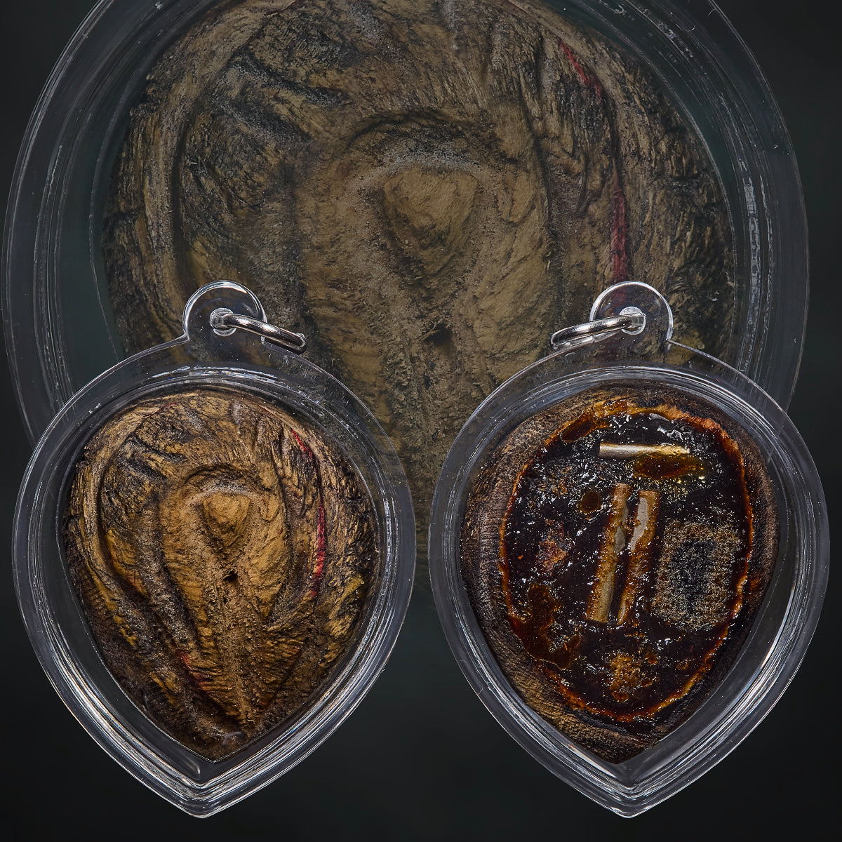 Crafted by Por Sala Tan in a moment of rare inspiration, this yoni-shaped amulet was created using relic fragments linked to a Mae Prai — a woman known in life for her extraordinary beauty and magnetism. Within Thai spiritual belief, relics or remains imbued with such strong worldly allure can transmit that same charm and energy to the bearer, if properly sanctified. Por Sala Tan, known for his mastery over natural and prai-based wiccha, selected this relic source for its unique energetic resonance.