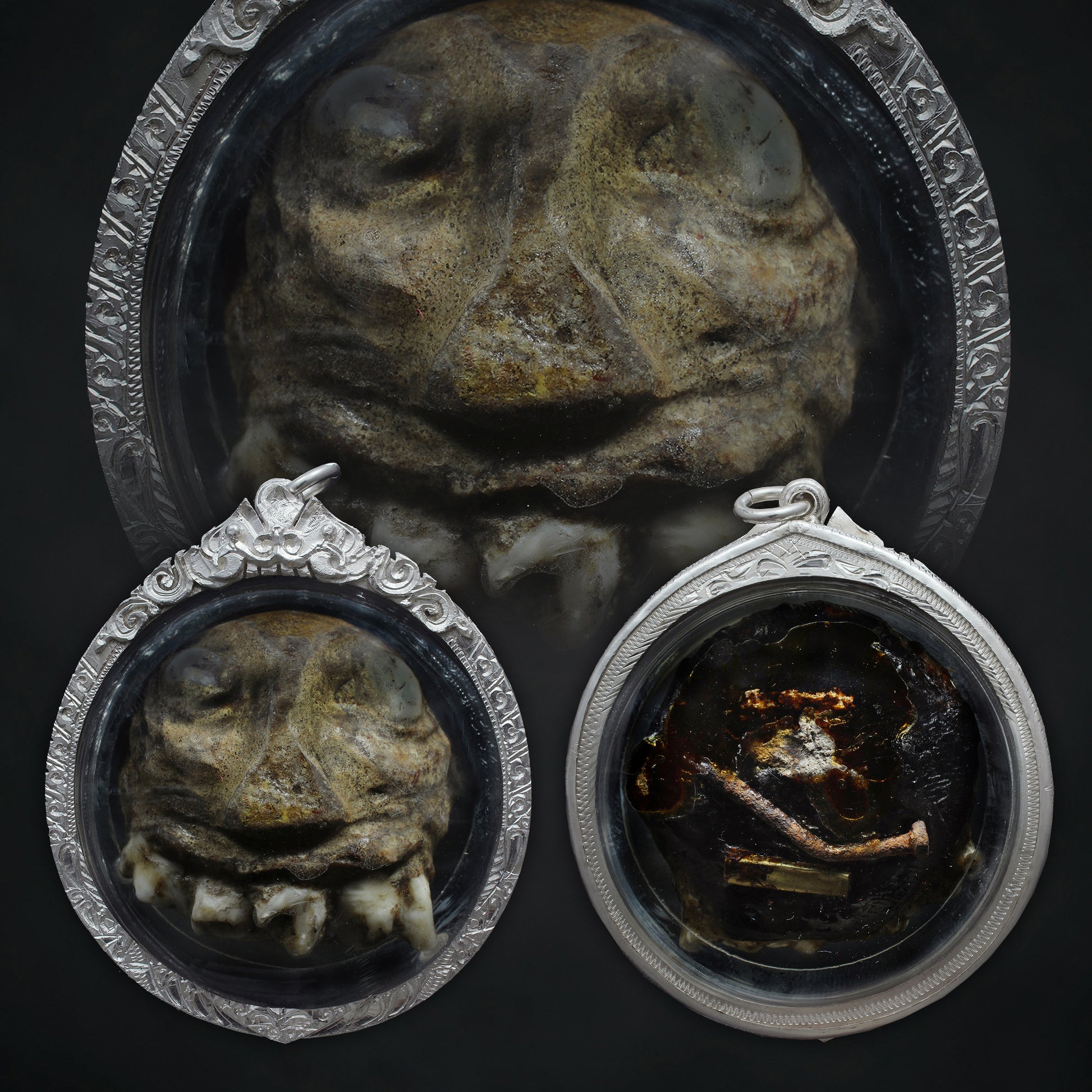 The front reveals the natural face-like formation of the barang, interpreted by Por Sala Tan as the jinn’s visage. The reverse holds embedded relics and takrut scrolls to stabilize and harmonize its power. Each component was selected to bind the spirit safely within Buddhist boundaries, ensuring it aids rather than overwhelms the user.