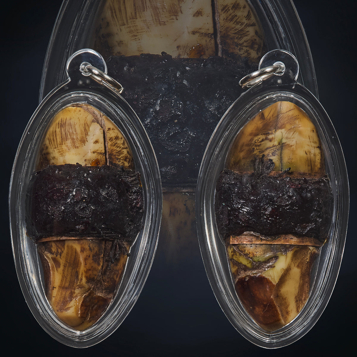 The relic embodies the essence of five tigers, each representing one of the five directions of power in traditional wiccha—north, south, east, west, and center. The material surrounding it is known as Nur Jai Suer, the heart essence of tiger spirits, used to bind the spiritual vitality of the five beasts into a single relic. The density, texture, and scent of the compound are clear indicators of Por Sala Tan’s authentic ritual method.