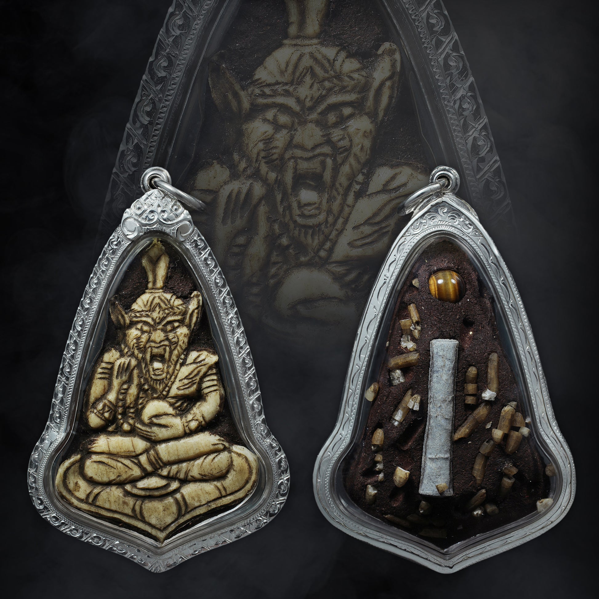 The back of the amulet, this piece containing relics of the lersi both before and after cremation, represents continuity of awareness. Relics from before cremation carry the practitioner’s living energy, while post-cremation relics symbolise the purified spiritual residue left behind after the body’s dissolution. Together, they create a sense of complete guidance—from active decision-making to long-term spiritual clarity.