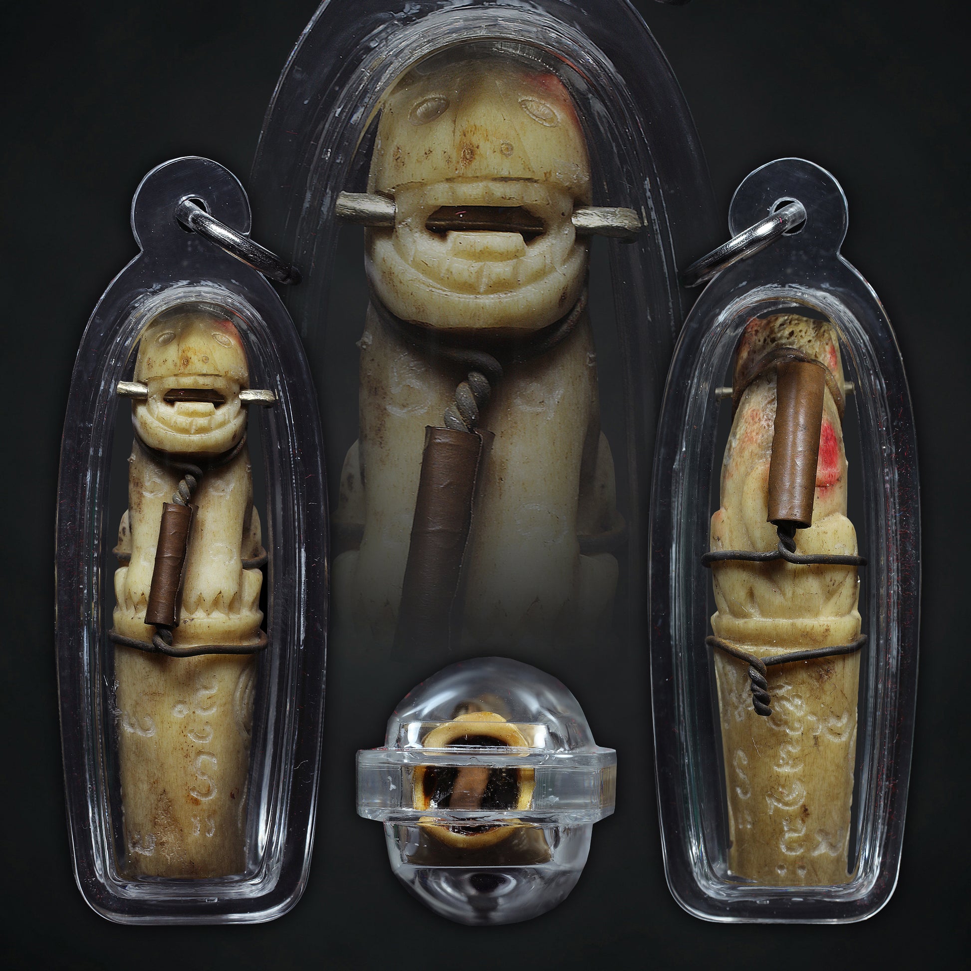 Por Sala Tan sourced this gaduk specifically for items that needed to carry the intellectual weight and charisma of a learned being. The form, binding style, and takrut placement follow the older northern method — one takrut bound in the mouth representing speech that carries influence, while the remaining takruts align the internal energy of the piece.