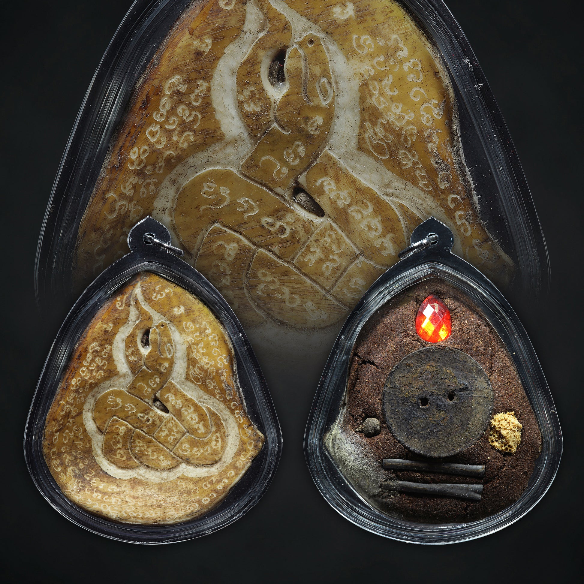 The reverse side is structured as a stabilising field. Cave soil and river soil were combined for grounding and flow—two opposing elements that balance each other. A very old coin anchors the amulet’s energy through its metal signature, preventing the power from becoming too “fast” or scattered. Above it, a naga gem signifies the deva realm’s clarity and is meant to steady the mind when navigating danger. A small paneang chip from a lersi who practiced naga arts adds lineage essence, ensuring the amulet behaves according to traditional naga wicha rather than merely functioning as decoration.