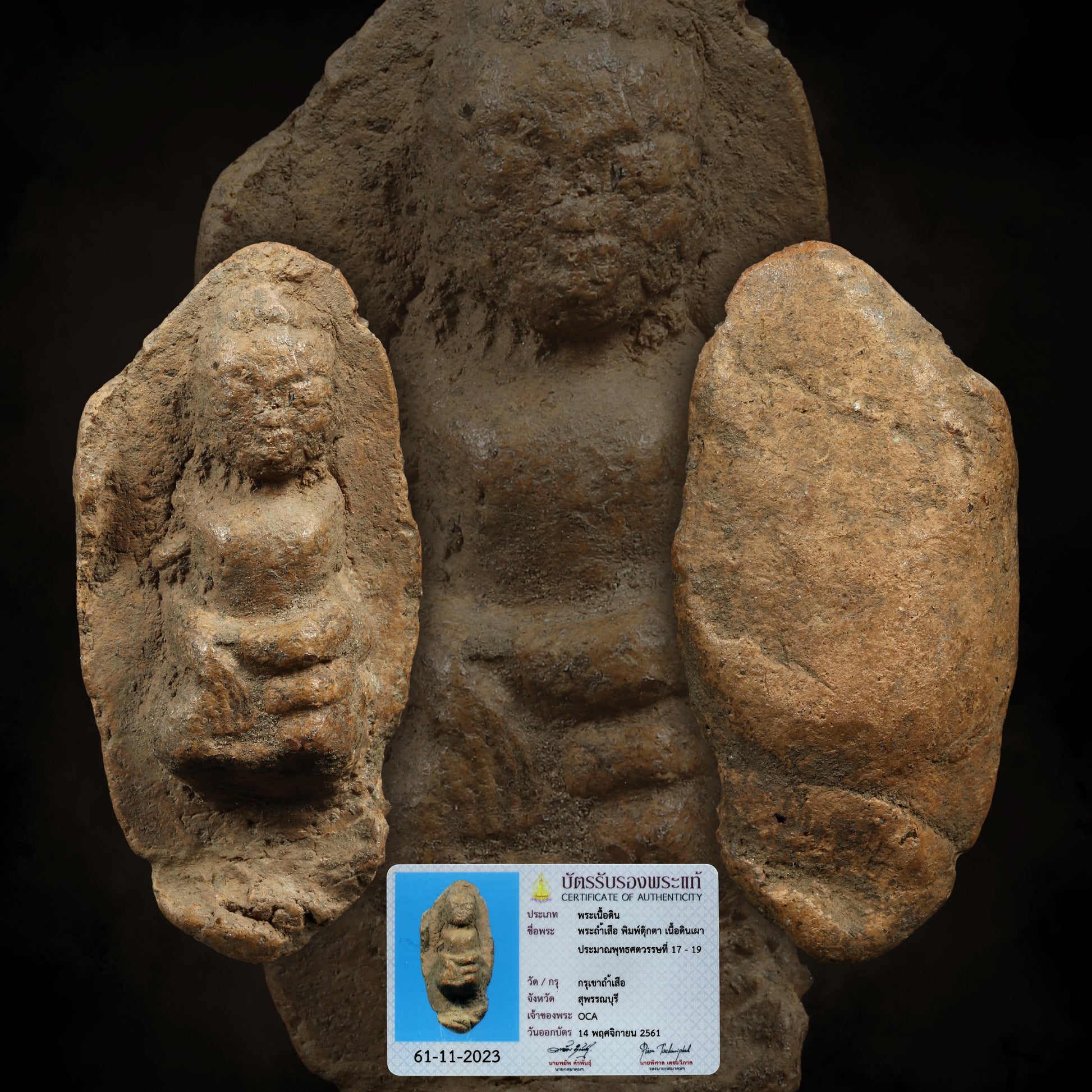 The first known discovery occurred around BE 2470, when a farmer collecting bat guano in the Tham Suea (“Tiger Cave”) stumbled upon a large quantity of unusual clay amulets. These were unlike the common temple issues of the time, with distinctive imagery and forms. The find was dispersed widely through sale and gifting.