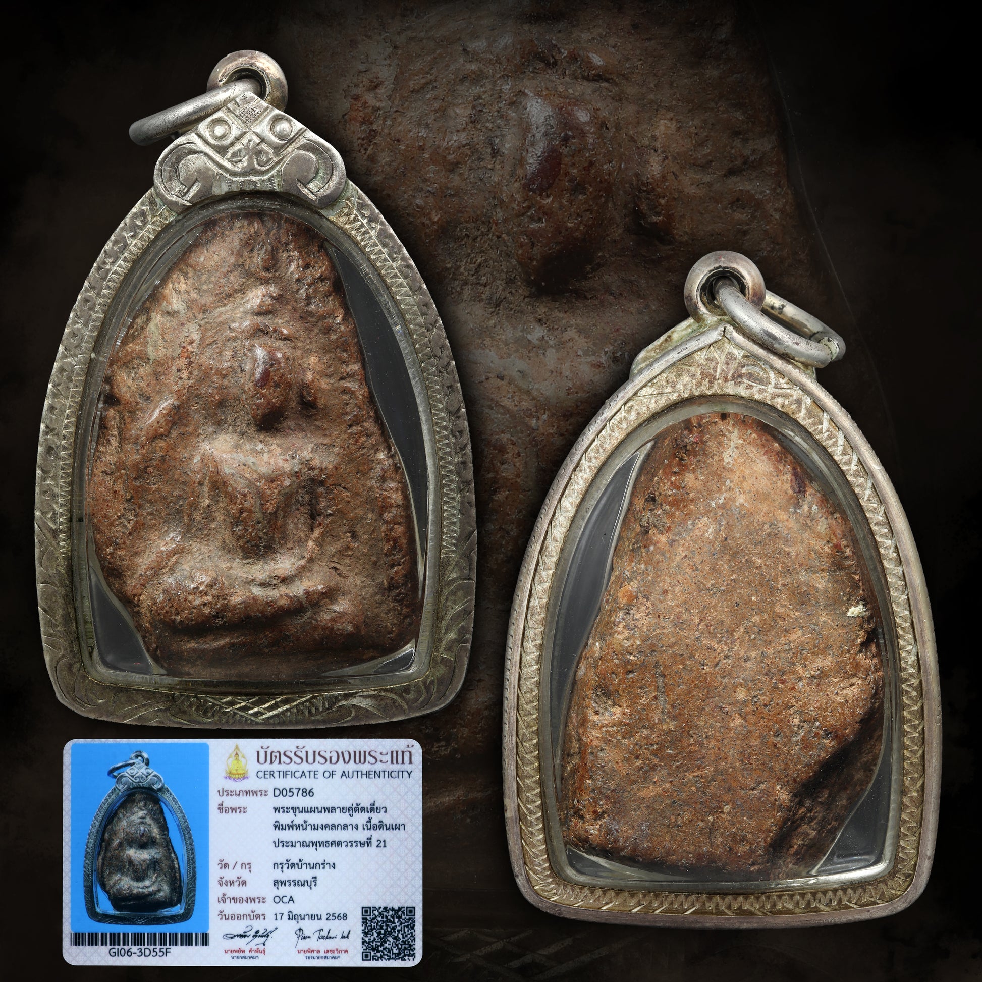 The amulets known today as Phra Khun Phaen Wat Ban Krang originate from an ancient reliquary site located at Wat Ban Krang, situated along the eastern bank of the Tha Chin River in Suphanburi. These amulets were first discovered in the early 20th century, unearthed from the rear chedi behind the old viharn of the temple. The site itself dates back to the Ayutthaya period, and the craftsmanship aligns closely with mid-Ayutthaya Buddhist art.